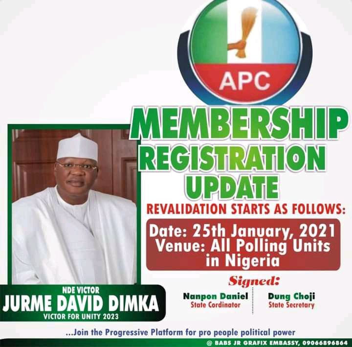 Press Release: The Leader of the DVD Movement in Plateau State, Nde Victor David Dimka fsi (rtd), has called on all eligible voters and patriotic members of the ruling All Progressive Congress ( APC) across the entire State to come out in their numbers and register on Monday, January 25, 2021. In a press statement issued in Jos today, the former Controller of Customs said the call by the ruling party presents a window of opportunity for those yet to be registered and those that may have relocated from other places to validate their membership of the party in readiness for future elections. According to him, duly registered members of any political party all over the world are the custodians and legitimate owners of the mandates that all elected officials hold, adding that, the only way citizens could hold their elected officials accountable was through the ballot boxes. He therefore urged members of the party to mobilize their people at the State, local government and ward levels to come out and register as directed by the leadership of the party. Nde Victor, while acknowledging the undying support given to the ruling party in the State over the years, expressed confidence that the party will continue to provide the desired services that would improve the livelihood of the citizens of the State. He therefore appreciated the efforts of the State government and leadership of the party for holding in trust the mandate given to them to serve by the people of the State. Sign: DVD Media Team