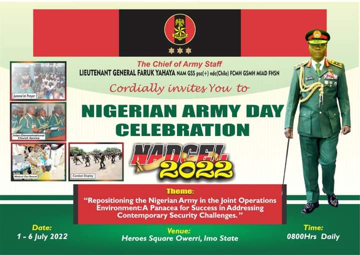 The Nigerian Army Day Celebration (NADCEL) is an annual event aimed at showcasing the commitment of the Nigerian Army (NA) over the years, as a professional responsive force. The event for year 2022 is scheduled to hold in Owerri, Imo State from 29 June to 6 July.